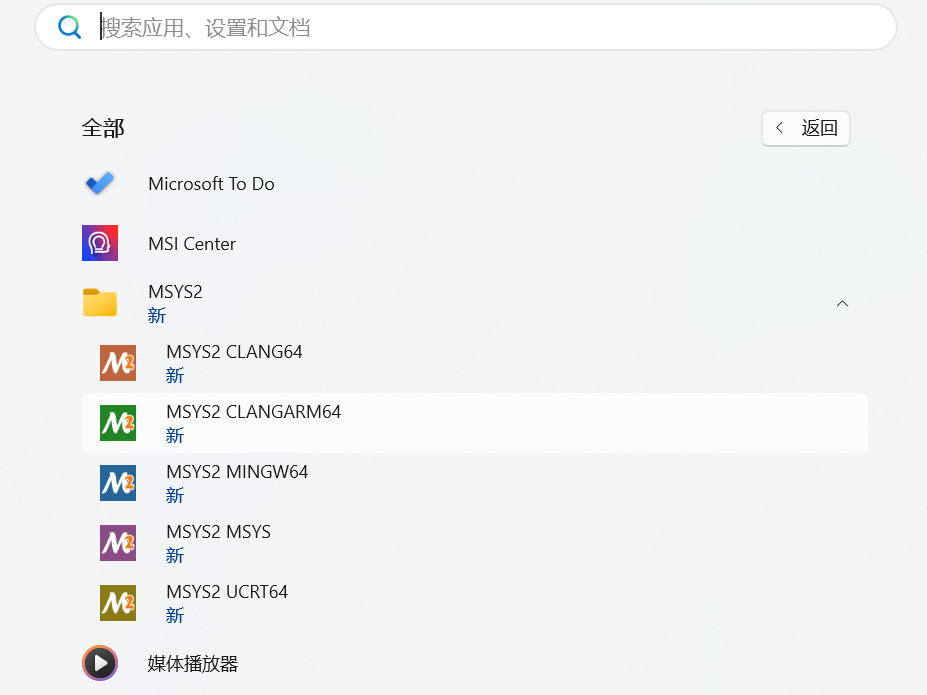 安装完毕后,在 Windows 的开始菜单中可以看到很多不同版本的 MSYS2,我们只需要留意其中的 MSYS2 CLANG64 版本即可